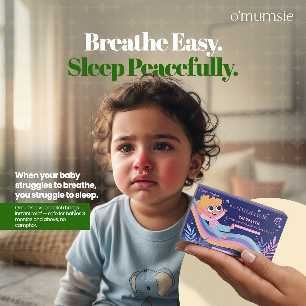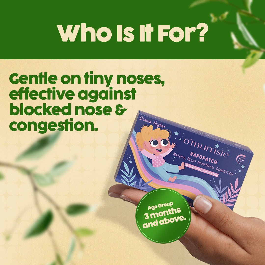 When little noses are blocked, even the simplest things—like breathing or sleeping—can feel difficult. That’s where Omumsie Vapopatch comes in. Infused with a unique blend of 7 powerful essential oils inspired by Thai Aromatherapy traditions, these natural vapour patches provide instant and long-lasting relief from nasal congestion, cough, and runny nose.