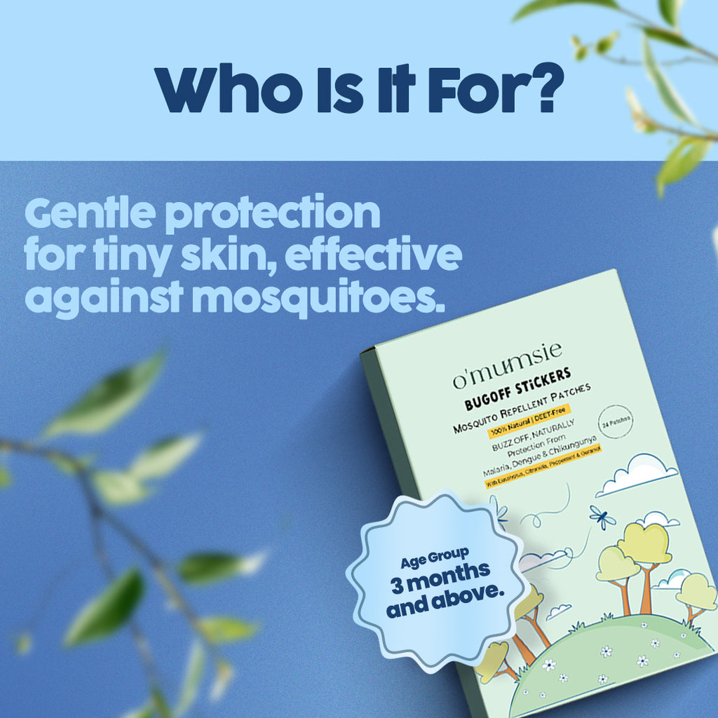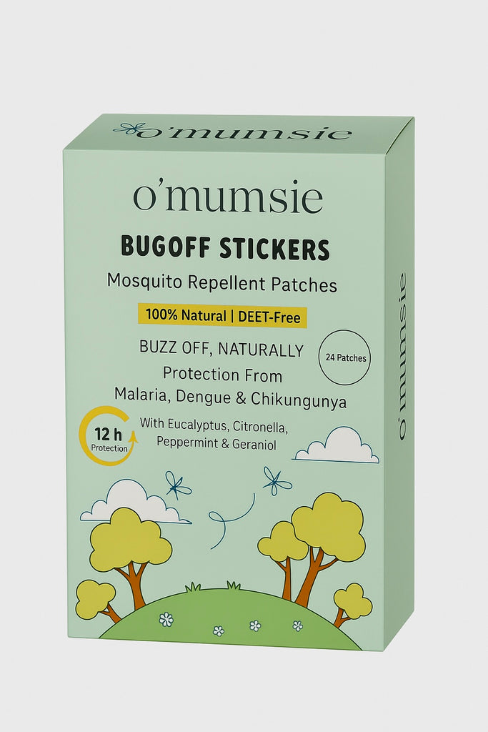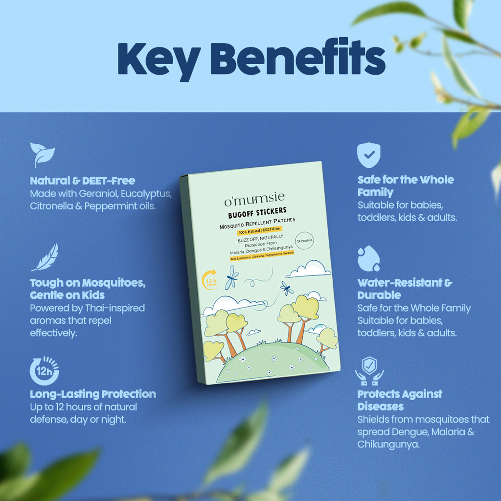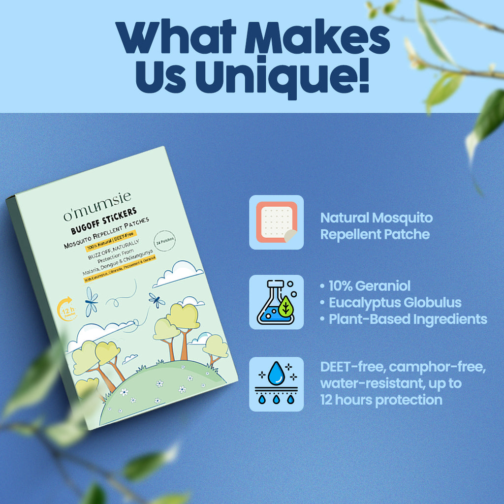 Protect your little ones with Omumsie BugOff™ Mosquito Repellent Patches, crafted with 10% Geraniol oil, Eucalyptus Globulus, and pure natural plant ingredients. These DEET-free patches combine the wisdom of nature with refreshing Thai-inspired aromas—gentle on kids, but tough on mosquitoes.