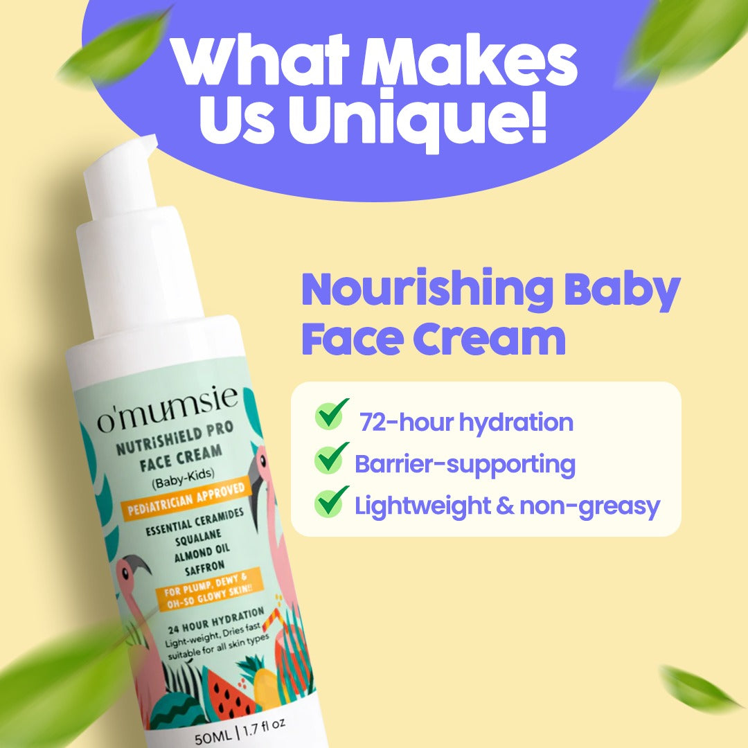 Your baby’s skin is precious, and it needs a cream that provides deep hydration, protection, and nourishment—without any greasiness! Omumsie Nutrishield Pro - Face Cream is thoughtfully crafted with skin-loving natural ingredients that work together to maintain a healthy skin barrier, prevent dryness, and promote a glowing, even-toned complexion.
